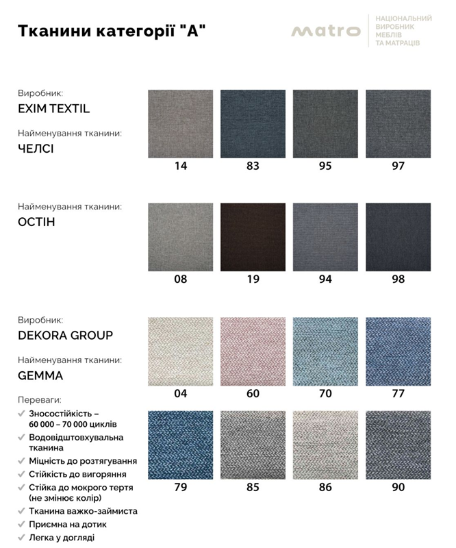 - Особливості: В базову ціну врахована 1 категорія тканин. Наступні категорії тканин з доплатою - уточнюйте в менеджера