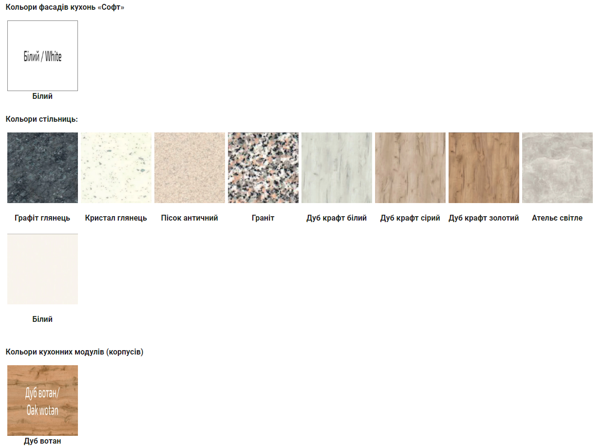 Дизайнери розробили велику кількість модульних елементів, що допоможуть задовільнити Ваші потреби і побажання. Корпуси кухні виконані з ЛДСП, в приємному, деревоподібному декорі "дуб вотан", високої якості. Стільниці комплектуються та продаються окремо. Якісні кріплення, телескопічні напрямні, роблять кухню Софт зручною та надійною в експлуатації. Білі фасади, можуть похвалитися трендовим дизайнерським рішенням оформлення і функції відкривання. Фігурне заглиблення виконує функцію ручки, що є надзвичайно практичним в експлуатації. У поєднанні з ефектними, матованими, скляними вітринами утворюється єдиний стильний комплекс, який здатен підкорити серце найвибагливішої господині.