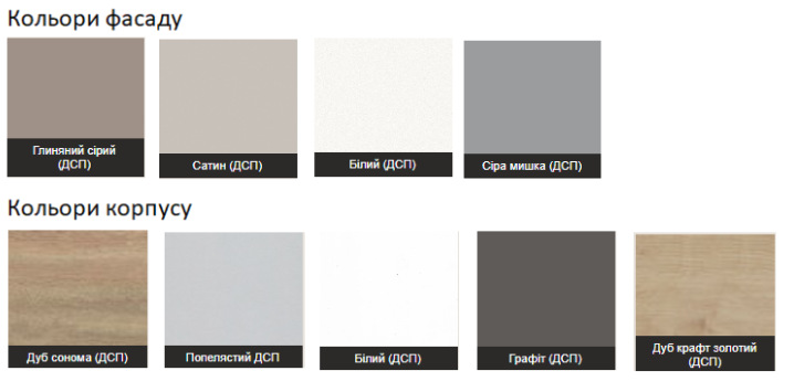 - Фасад ДСП: Білий / Сатин / Глиняний сірий / Сіра мишка