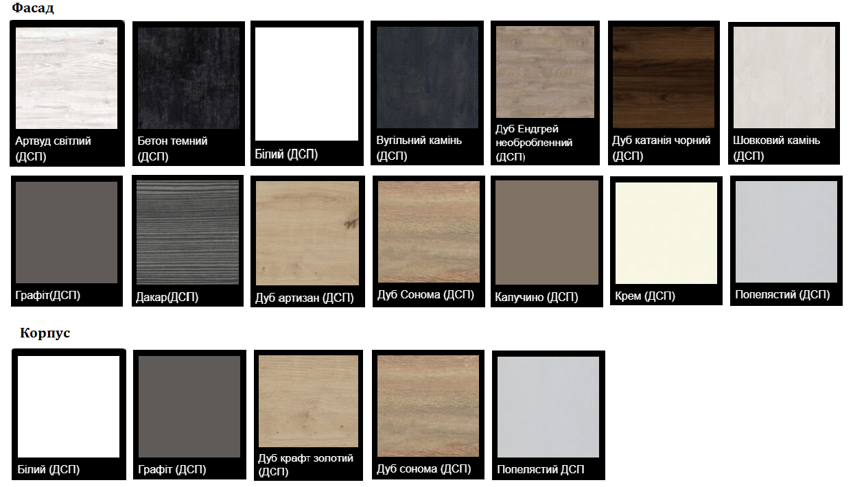 Фасад ДСП: артвуд світлий, бетон темний, вугільний камінь, білий, шовковий камінь, дакар, дуб артизан, дуб Енгрей необроблений, дуб сонома, дуб трюфель, крем, світлий беж, попелястий, індастріал, капучино, графіт, дуб катанія чорний.