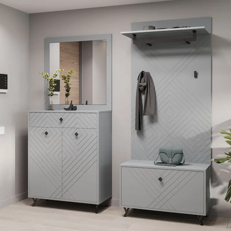 Передпокій Сокме Камео – це стильний та функціональний комплект, що складається з чотирьох модулів, які забезпечують ефективне зберігання верхнього одягу, взуття та аксесуарів. Завдяки сучасному дизайну з геометричним малюнком та благородному сірому відтінку "Шиншила сіра", цей набір стане ідеальним доповненням до будь-якого інтер’єру.