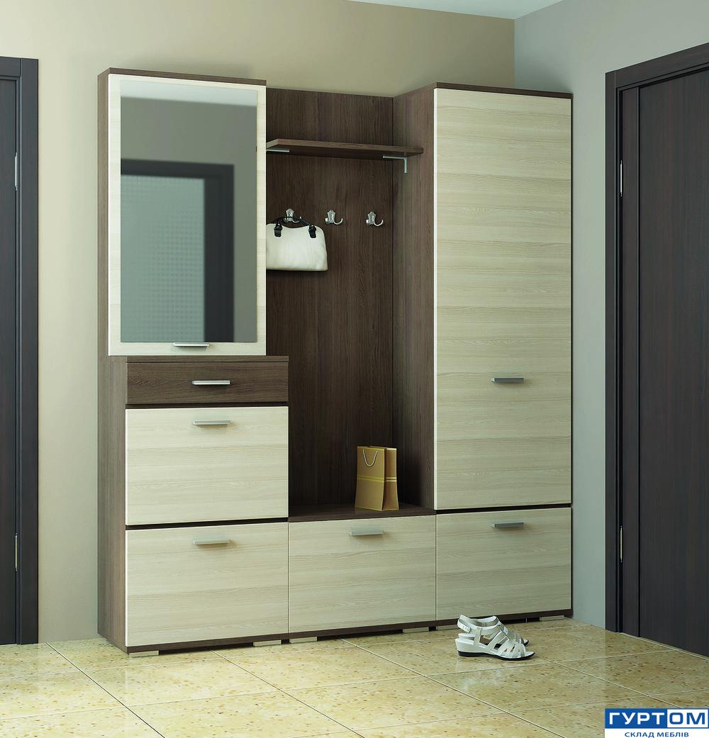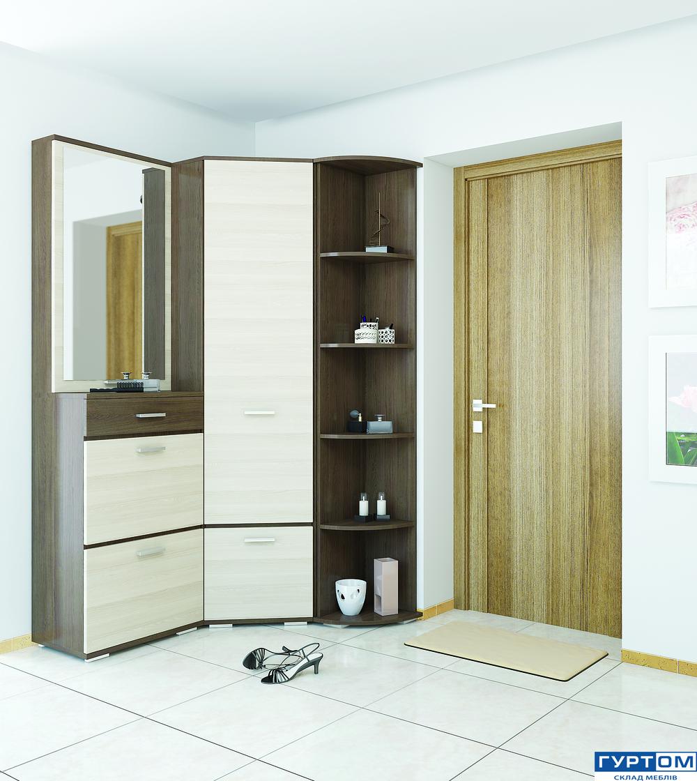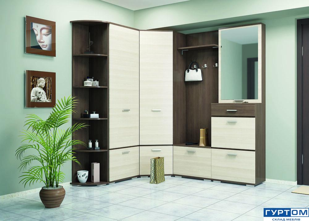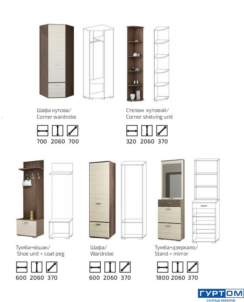 Передпокій Віва — гармонійне поєднання стилю, практичності й естетичності. Меблі в молочно-кавових і коричневих відтінках «ясеня шимо» створює цікаве поєднання, віддаючи приміщенню тепло і наповнюючи його світлом. Текстура натуральної деревини — родзинка меблів. Система модулів дозволяє розділити комплект на кілька частин і заповнити простір більш ефективно. Передпокій чудово впишеться в мінімалістичний інтер’єр, візуально розширюючи приміщення. До комплекту модулів Віва входять: велика шафа, полиці та кілька містких тумб, дзеркало з правильною формою. Шафа доповнена висувним вішаком і внутрішньою полицею. Завершують композицію міцні металеві гачки.