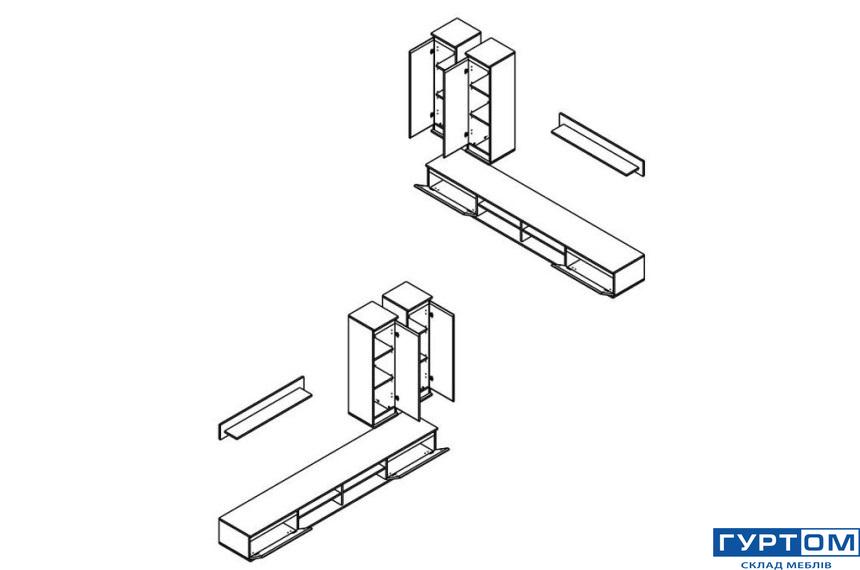 - Розмір модулів: Пенал навісний - Д-30 Г-28 В-100; Тумба під ТВ - Д-220 Г-37 В-29; Полиця - Д-99