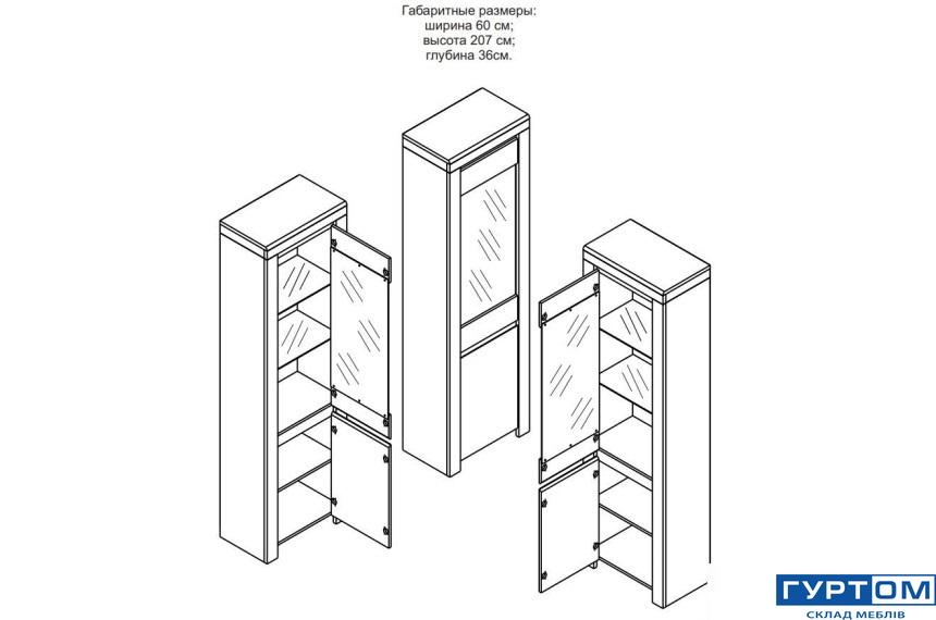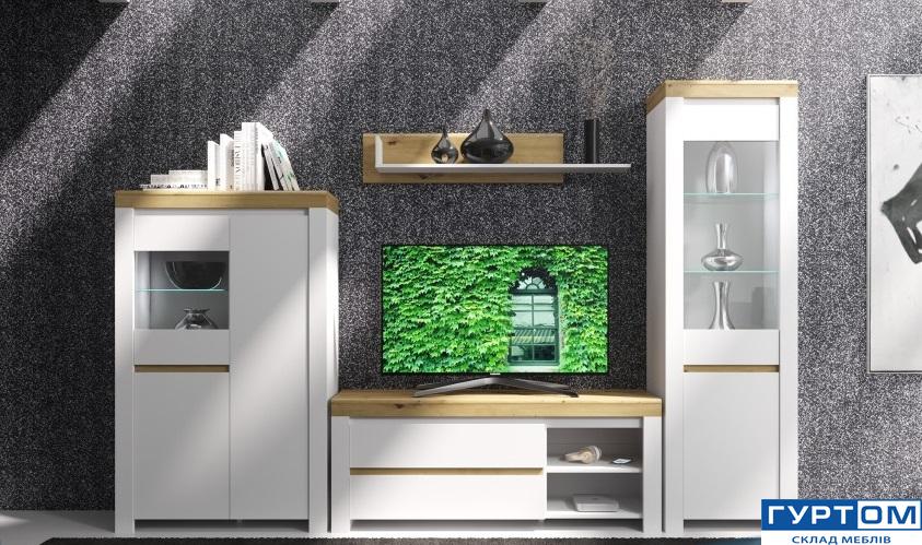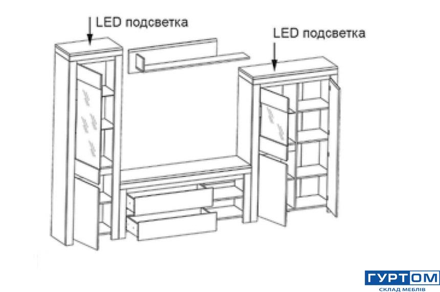 - Розмір модулів: Вітрина низька - Д-96 Г-36 В-156; Вітрина висока - Д-60 Г-36 В-207; Тумба під ТВ - Д-150 Г-36 В-61; Полиця - Д-130 Г-19 В-25;