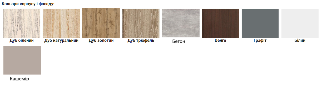 - Кольори: Дуб білений | Дуб натуральний | Дуб золотий | Дуб трюфель | Бетон | Венге | Графіт | Білий