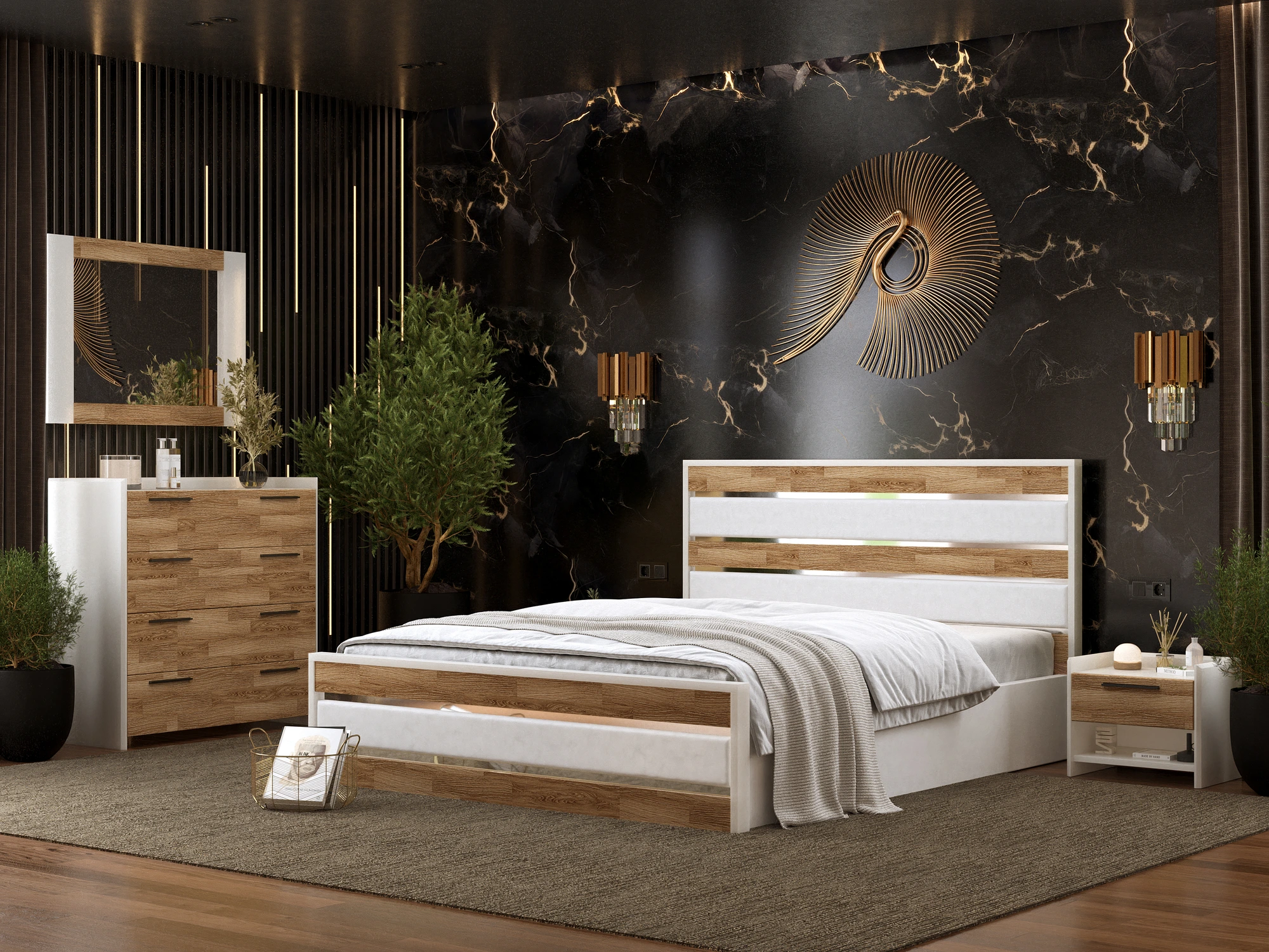 - Покриття: В узголівї та узніжжі використовується дзеркальний пластик срібного кольору., дерев’яні вставки покриті натуральним маслом в натуральному кольорі сосни та бука, рамка виконується у 3 кольорах білий, сірий та венге, Оббивка м’якої частини виконується тканиною велюр відповідно білого, сірого та чорного кольору.