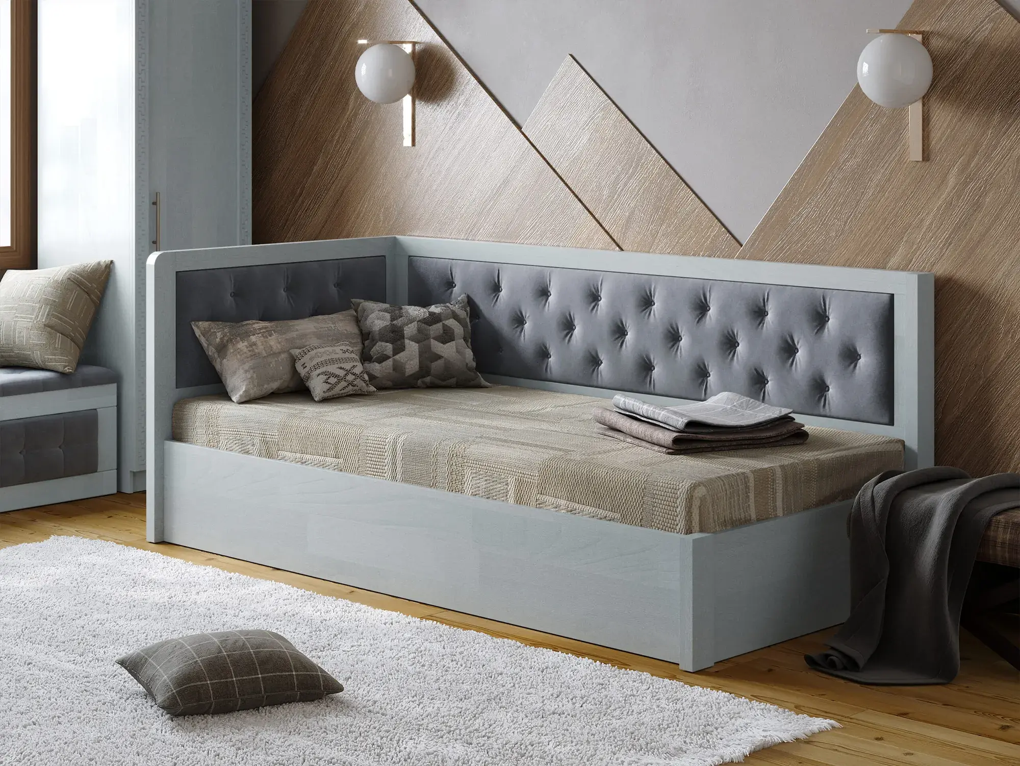 - Основа під матрац: Ліжко продається з м’якою оббивкою., металевий каркас з пійомним механізмом, крок між ламелями 45 мм. Дно ХДФ