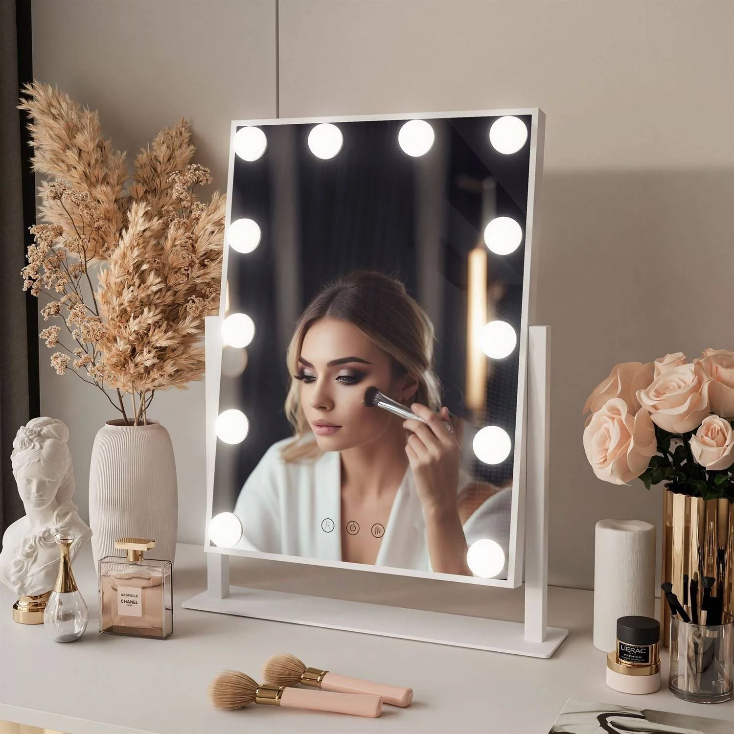 - Ідеальне освітлення: оснащене 12 лампочками нейтрального світла, це дзеркало рівномірно розсіює освітлення, даруючи комфорт і чіткість відображення під час макіяжу чи догляду за шкірою.