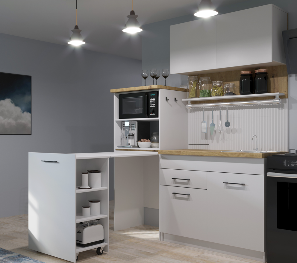 - 03: УНІВЕРСАЛЬНЕ ПРИЛАДДЯ : місце для мікрохвильовки, яке легко перетворюється у нішу для духової шафи