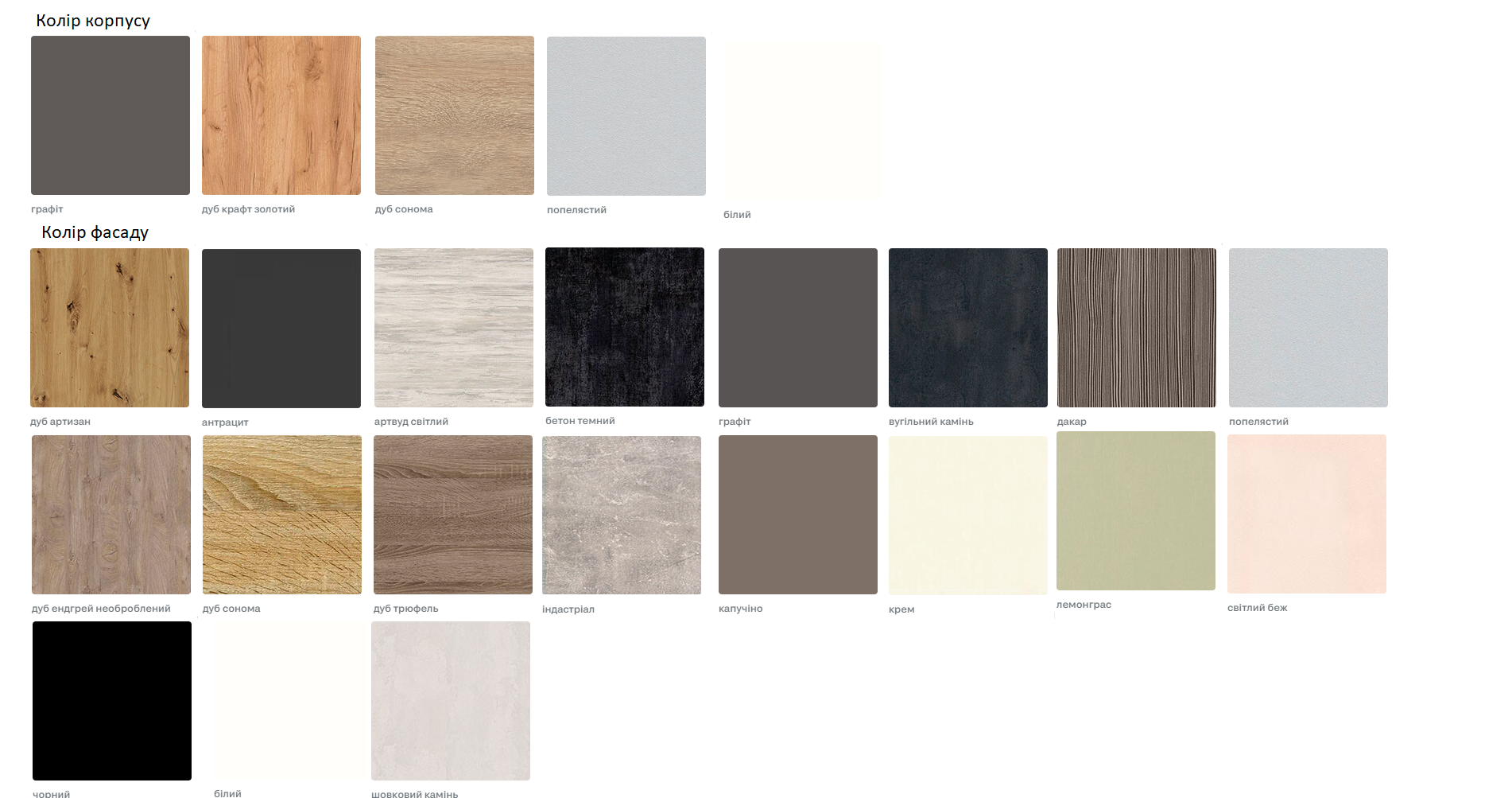 - Фасад: ДСП : Колір фасаду 20 шт (дуб артизан, білий, чорний, дакар, крем, індастріал, дуб сонома, індиго, антрацит, дуб трюфель, капучіно, графіт, лемонграс, артвуд світлий, бетон темний, вугільний камінь, дуб ендгрей необроблений, шовковий камінь, попелястий, світлий беж);