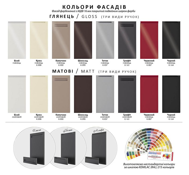 - Фасад: фарбований МДФ 16 мм., покритий подвійним шаром фарби. \ під замовлення кольори в асортименті згідно вказаної палітри кольорів