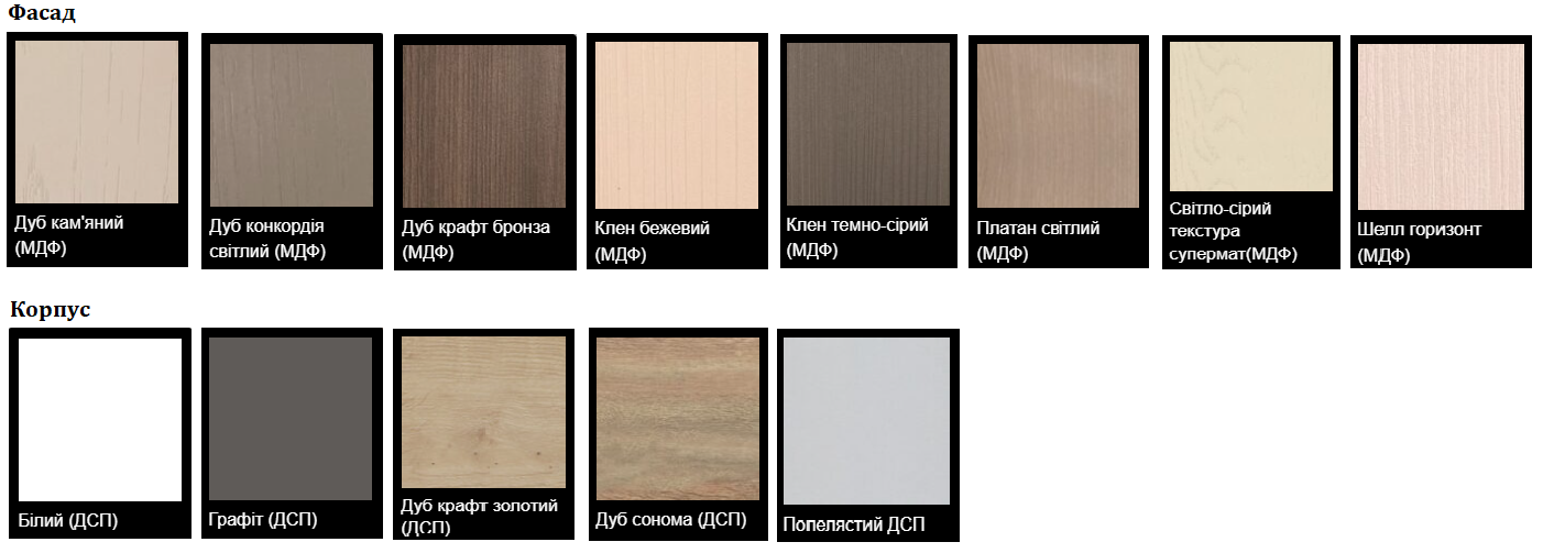- Фасади МДФ: Світло-сірий текстура супермат / Дуб кам’яний / Дуб конкордія світлий / Дуб крафт бронза / Клен бежевий / Клен темно-сірий / Платан світлий / Шелл горизонт.