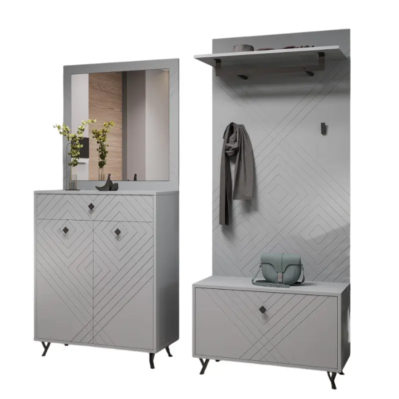 Передпокій Сокме Камео – це стильний та функціональний комплект, що складається з чотирьох модулів, які забезпечують ефективне зберігання верхнього одягу, взуття та аксесуарів. Завдяки сучасному дизайну з геометричним малюнком та благородному сірому відтінку "Шиншила сіра", цей набір стане ідеальним доповненням до будь-якого інтер’єру.