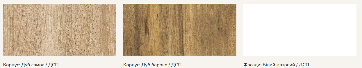 - Кольори: дуб бароко, дуб самоа