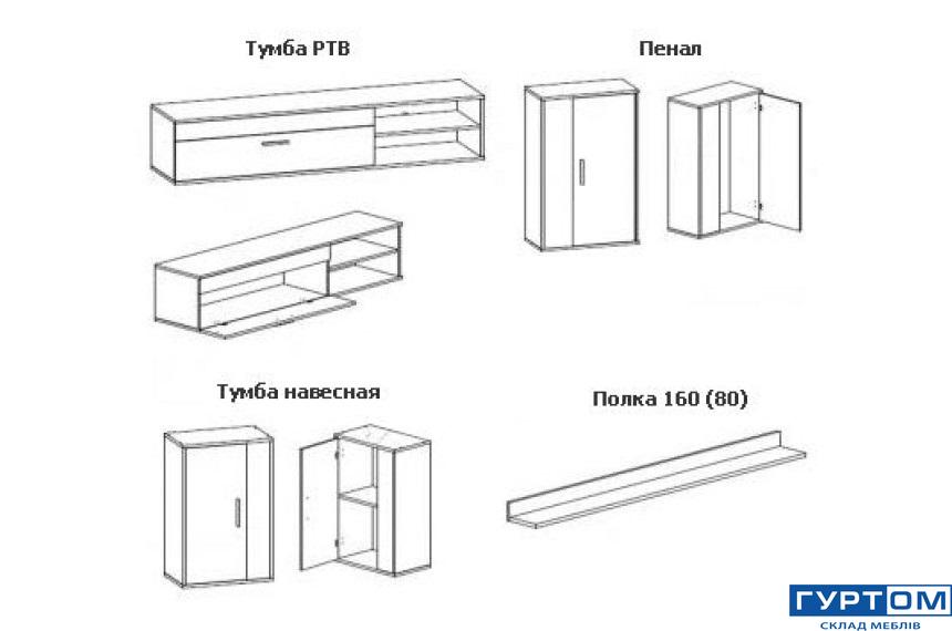- Розмір модулів: Тумба - Д-60 Г-30 В-93; Шафа навісна - Д-50 Г-30 В-77; Тумба під ТВ - Д-180 Г-37 В-40; Полиця 160 - Д-160 Г-17 В-8; Полиця 80 - Д-79 Г-17 В-8