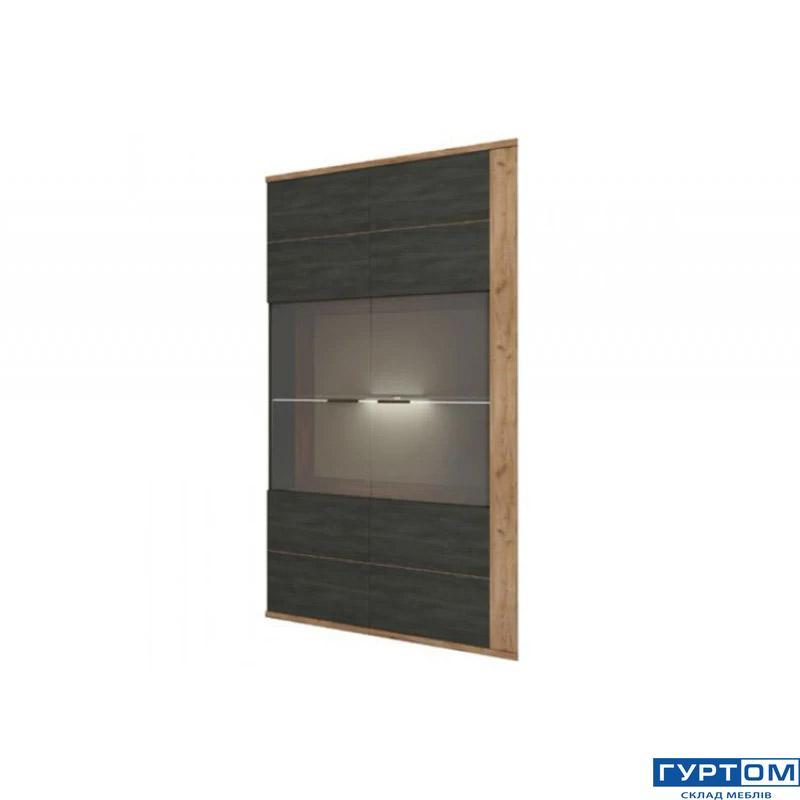 У даній вітальні було використано поєднання двох темних деревоподібних декорів. Елементи вітальні можуть бути як правосторонніми, так і лівосторонніми. Оригінальне виконання фасадів у комбінації з склом бронзового кольору надає даній вітальні приємної темно-димчатої тональності. Додатково доступна підсвітка скляних полиць.